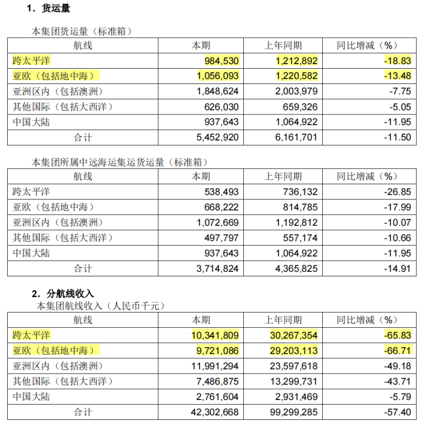 今年一季度,中远海控跨太平洋航线(美洲地区)货运量同比下跌18.83%,以人民币计收入同比下跌65.83%;亚欧(包括地中海)航线货运量同比下跌13.48%,以人民币计收入同比下跌66.71%。
