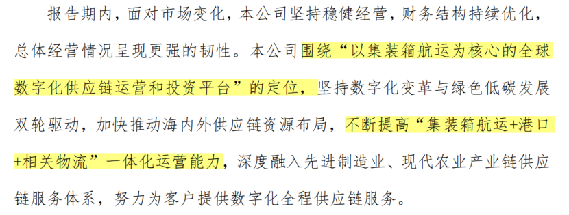在上半年业绩预告中,中远海控称,面对市场变化,将围绕“以集装箱航运为核心的全球数字化供应链运营和投资平台”的定位,加快推动海内外供应链资源布局,不断提高“集装箱航运+港口+相关物流”一体化运营能力。