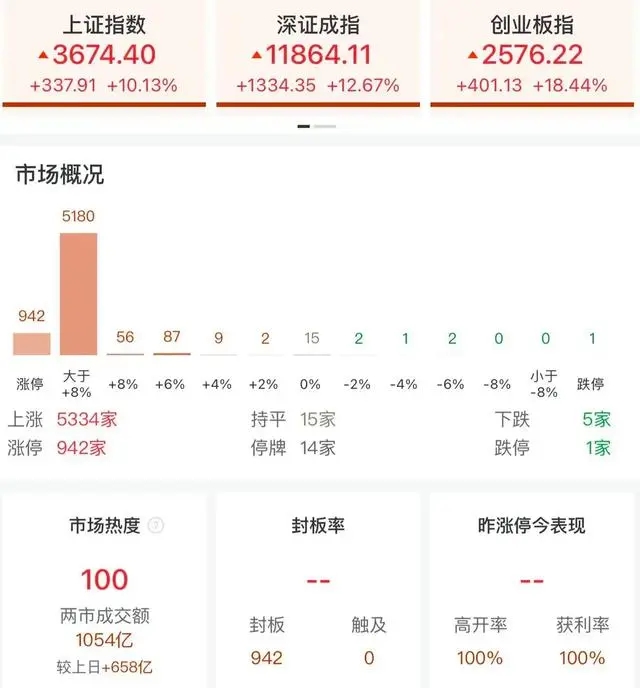 盘面上,近千只股票竞价涨停。据Wind统计显示,两市及北交所共5329只股票上涨,5只股票下跌,平盘有15只股票。