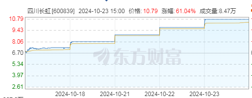10月23日,四川长虹(600839.SH)涨停,已连收6个涨停板。截至收盘,该股报10.79元/股,创下2015年8月以来近9年的新高,最新总市值达498.1亿元。
