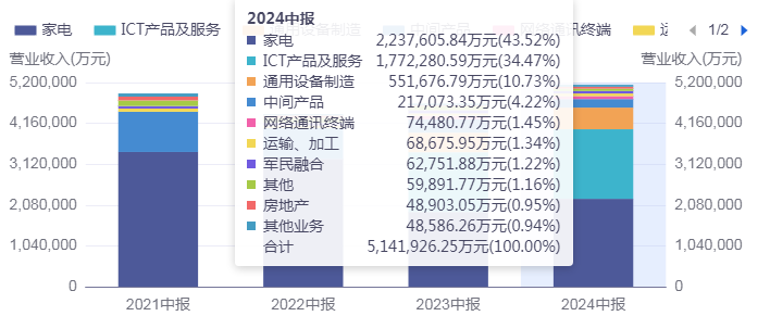 按照行业分,四川长虹有两大核心业务:一个是家电,另一个是ICT产品及服务。