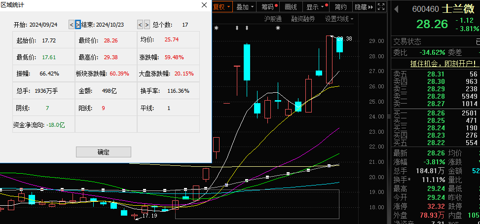 从盘面表现看,近段时间以来,半导体板块震荡拉升,士兰微在近17个交易日累计上涨59.48%,在整个板块中涨幅居前,体现了市场资金对其未来发展的看好。截至10月23日收盘,士兰微下跌3.81%,报28.26元/股。