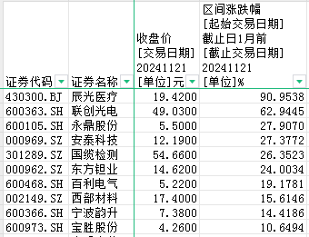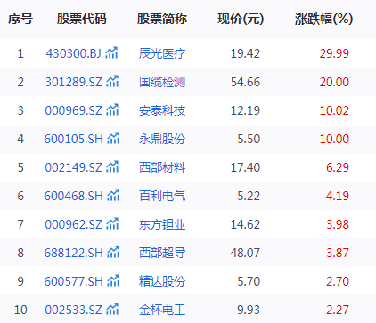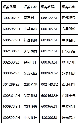 从二级市场表现看,过去一个月,10家上市公司股价涨幅超过10%,占比50%。其中,辰光医疗涨幅高达91%,位居第一;联创光电涨幅超60%;永鼎股份、安泰科技、国缆检测、东方钽业4家涨幅超20%。