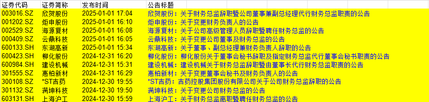 财务总监/负责人辞职的11家上市公司分别是:欣贺股份、炬申股份、海源复材、云鼎科技、东湖高新、柳化股份、建设机械、惠柏新材、*ST吉药、满坤科技、上海沪工。