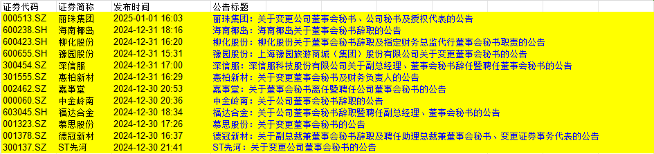 董秘辞职的12家上市公司分别是:丽珠集团、海南椰岛、柳化股份、豫园股份、深信服、惠柏新材、嘉事堂、中金岭南、福达合金、慕思股份、德冠新材、ST先河。