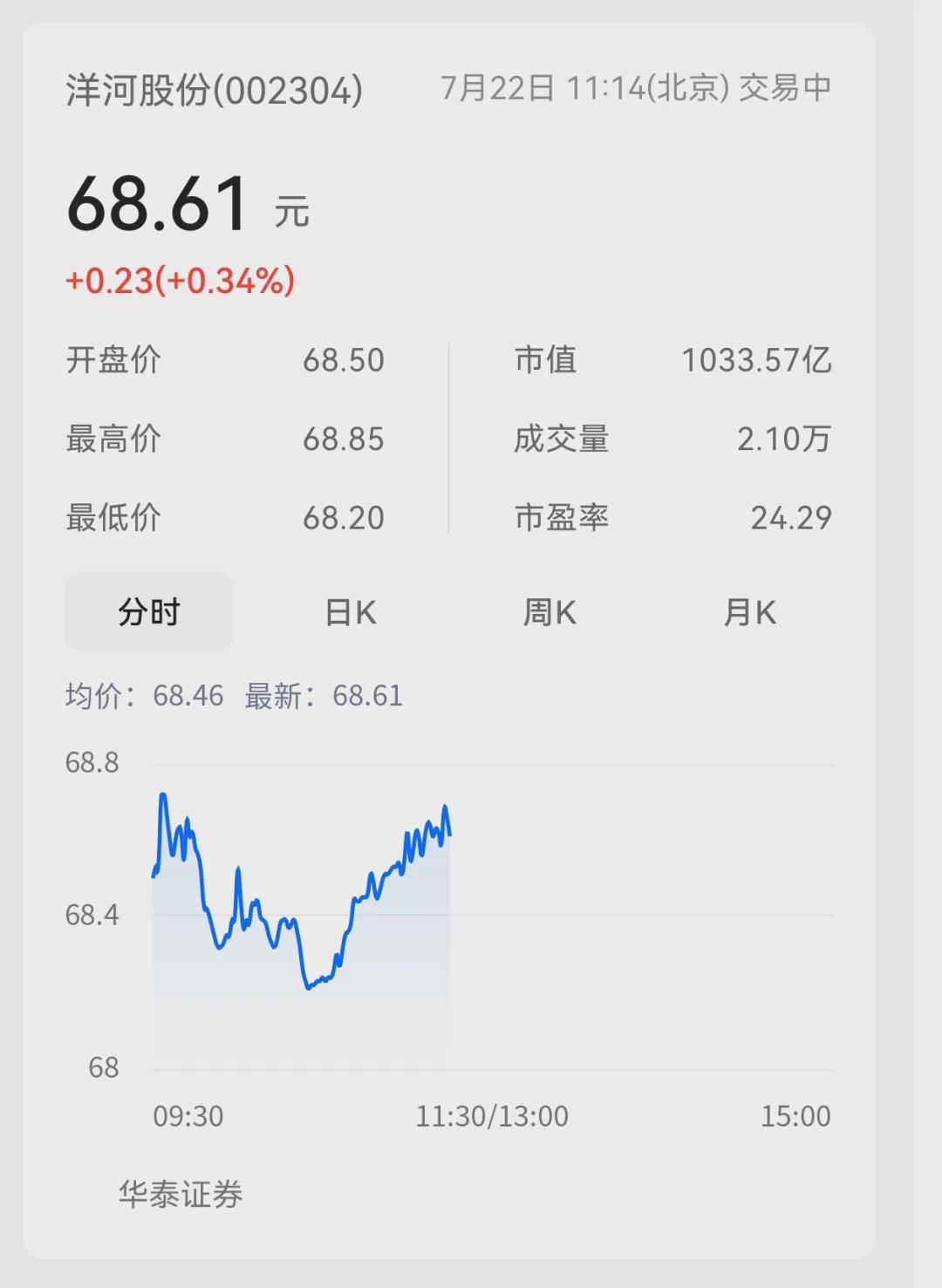 从市场反应来看,截至7月22日11时14分,洋河股份股价为68.61元,涨跌额为+0.23,涨跌幅为+0.34%,总市值为1033.57亿,股价呈现出一定的稳定态势。这也在一定程度上反映了市场对顾宇上任的期待和信心。