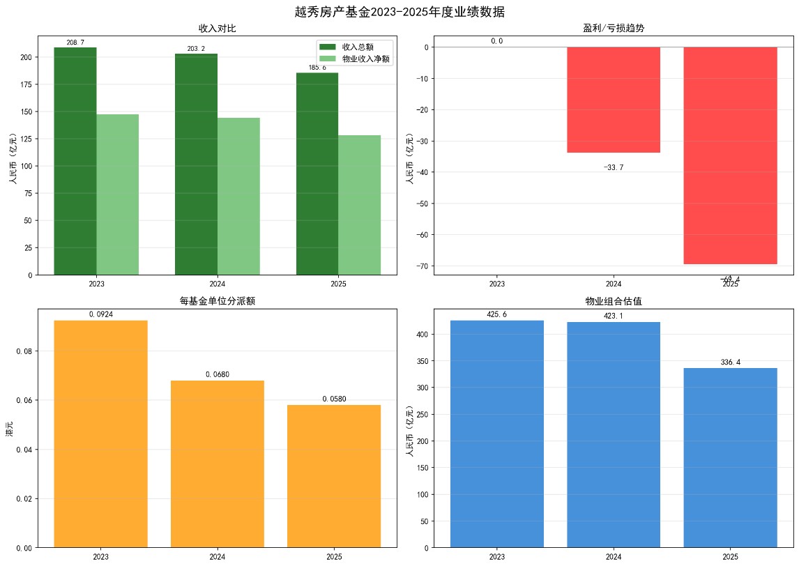 利润端的情况更严峻。2025年除税后亏损约6.94亿元,而2024年同期亏损为3.37亿元,亏损幅度扩大了一倍多。这是一个需要正视的现实:越秀房产基金已经连续两年亏损,且亏损规模在扩大。