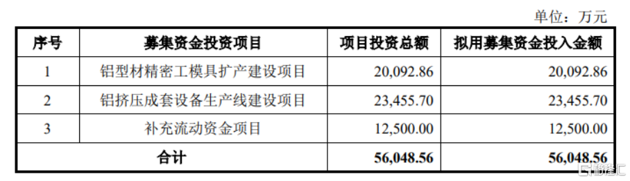 本次IPO拟募资5.6亿元,主要用于铝型材精密工模具扩产建设项目、铝挤压成套设备生产线建设项目、补充流动资金项目。