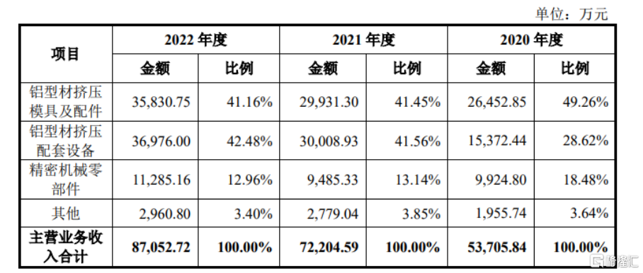 公司目前主要从事铝型材挤压模具及配件、铝型材挤压配套设备和精密机械零部件的销售业务。主营业务中的其他主要为贸易业务收入,根据客户需求而销售的配套物资, 如热固性粉末涂料、毛毡、铝制品等,以及加工费收入。