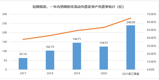 据阿尔法工场研究院统计,新希望流动负债和一年内到期的非流动负债从2017年的63.14亿扩张到2021年前三季度的240.05亿,资产负债率也从2017年的38.2%上涨至64.83%。