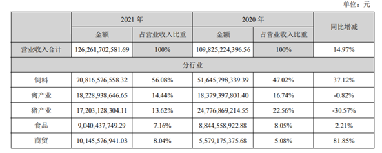 6大业务板块中,禽产业和猪产业营收同比表现为负增长,猪产业表现最甚,营收同比2020年减少超3成,占总营收比重由22.56%下降至13.62%。
