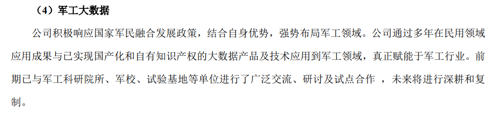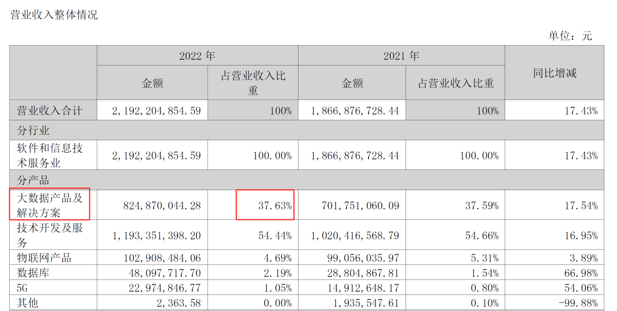 数据业务占比并不低。2022年年报中,公司提到“探索构建工业、军工行业数字化转型能力引擎并形成整体解决方案”,财报显示,当年大数据产品及解决方案占营收比重为37.63%,收入为8.25亿元。