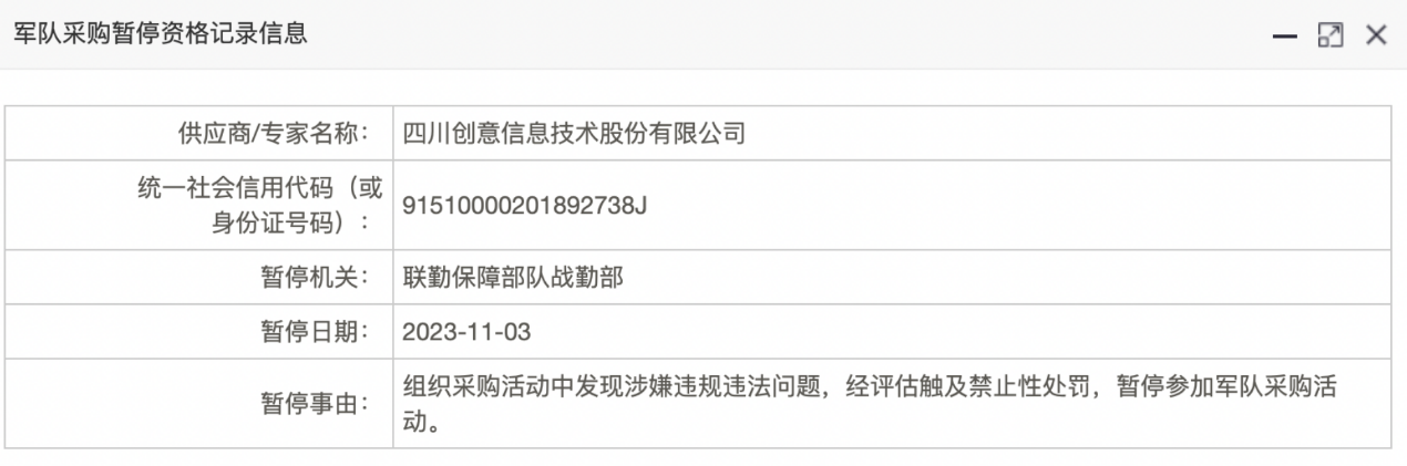 据军队采购网显示,四川创意信息技术股份有限公司作为供应商,在采购过程中被发现涉嫌违规违法问题,经评估决定暂停其参加军队采购活动。