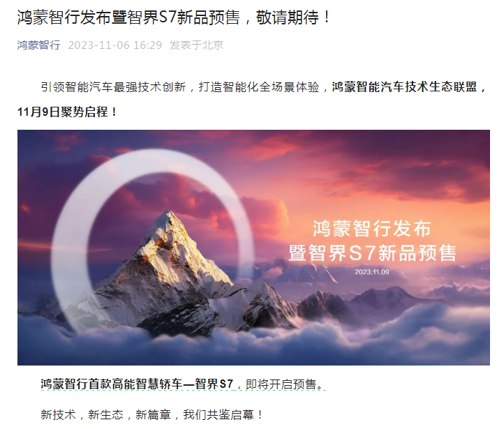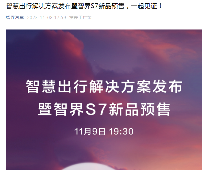 11月8日,公众号智界汽车再次发布智界S7的宣传海报,这也是刚刚成立的一个新号,文章标题成了《智慧出行解决方案发布暨智界S7新品预售,一起见证!》