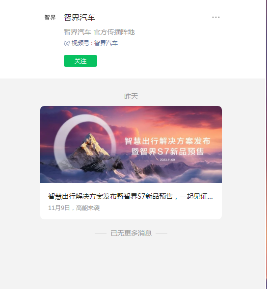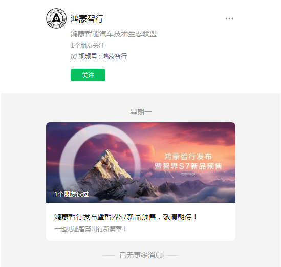 智界S7的官方宣传平台显得相当有意思了。11月6日,公众号鸿蒙智行发布了一则《鸿蒙智行发布暨智界S7新品预售,敬请期待!》的消息,这也是该公众号的“处女座”。