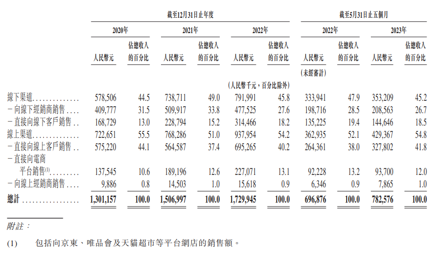 2020年、2021年、2022年及2023年前5月,燕之屋通过在线渠道销售产生的收入分别占同期总收入的55.5%、51.0%、54.2%、52.1%及54.8%。