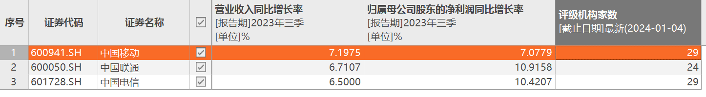根据Choice数据,国内三大通信运营商2023年三季报显示,中国移动营业收入同比增长率最高,中国联通归母净利润同比增长率最高。从最新评级机构数量来看,移动和电信都为29家,联通为24家。