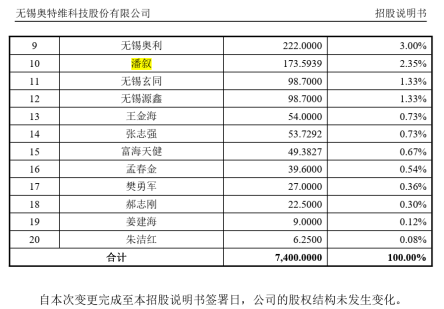 3个月后,即2015年10月奥特维改制成为股份公司,此时她所持出资额折股成168.75万股,占公司的股权比例为3.75%。2016年3月10日奥特维在新三板挂牌。2016 年10月16日,此时已是公司董秘的潘叙又以1.5元/股的价格增持32.59万股。持股数量增至201.34万股,占公司股本比例为3.02%。