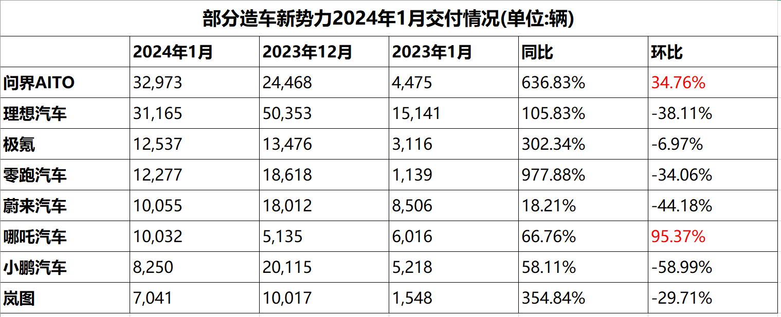 2月1日,新能源车企相继交出2024年首月成绩单。但从数据来看,部分新势力车企今年开局压力颇大,1月交付量环比下降,并未延续去年12月的高销量。