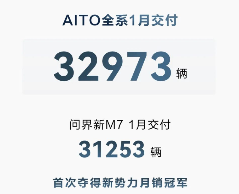 具体来看,今年1月问界全系交付32973辆,同比增长636.83%,环比增长34.76%。值得注意的是,在去年年末冲刺过后,1月车市普遍遇冷,问界的逆势上涨在这一背景下更加显眼。