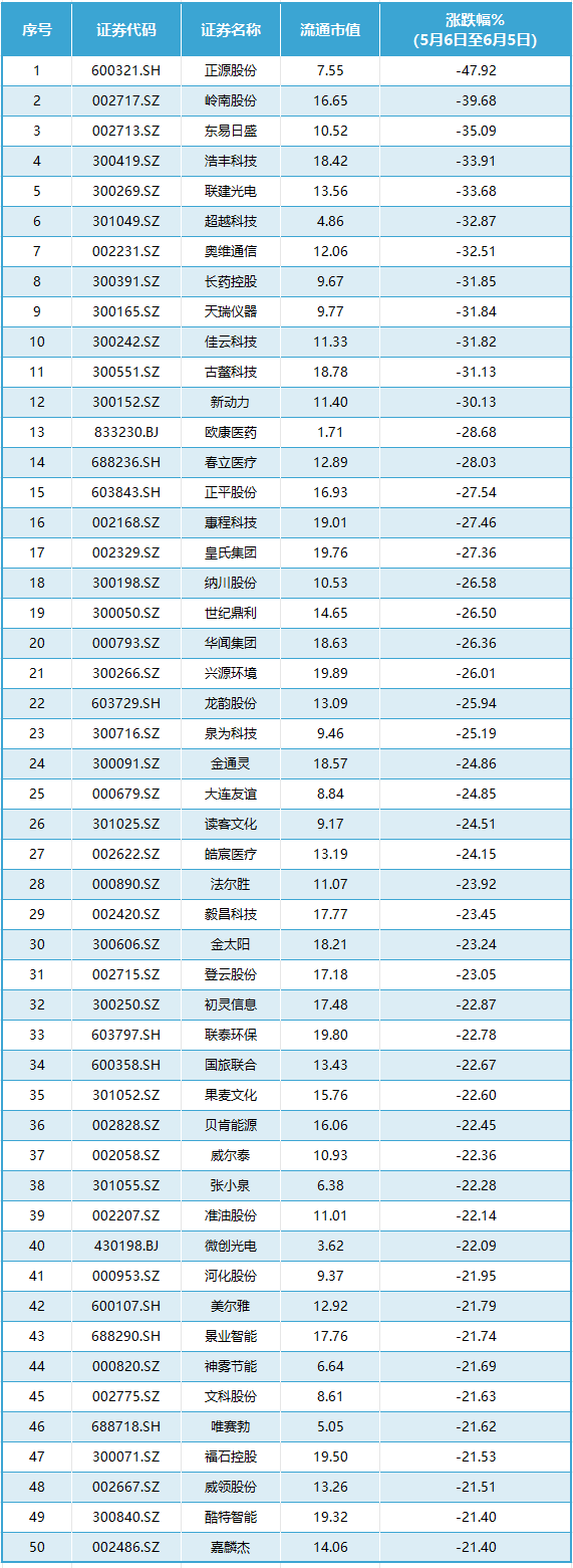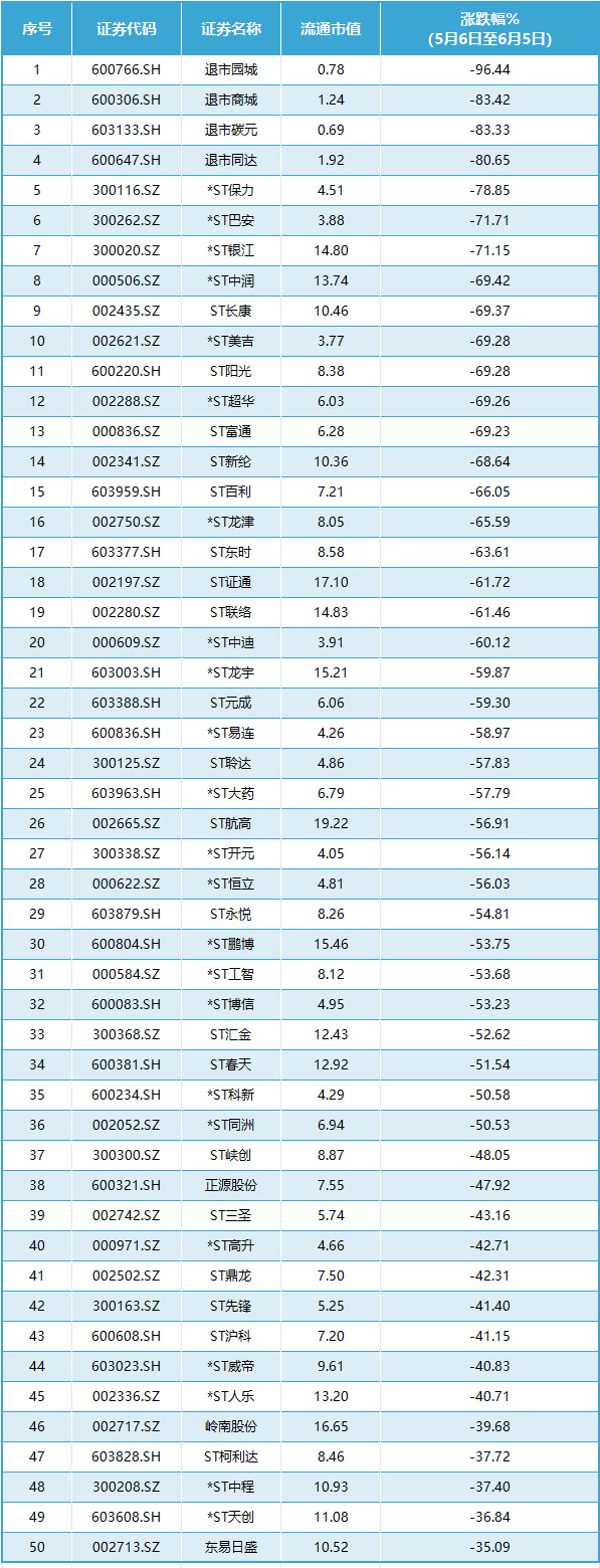 除退市园城外,退市同达(600647.SH)、退市碳元(603133.SH)也从6月5日正式进入退市整理期。截至6月5日收盘,退市园城下跌96.44%,退市同达下跌80.65%,退市碳元下跌83.33%,这三只个股也出现在近1个月低市值股票跌幅榜前列。