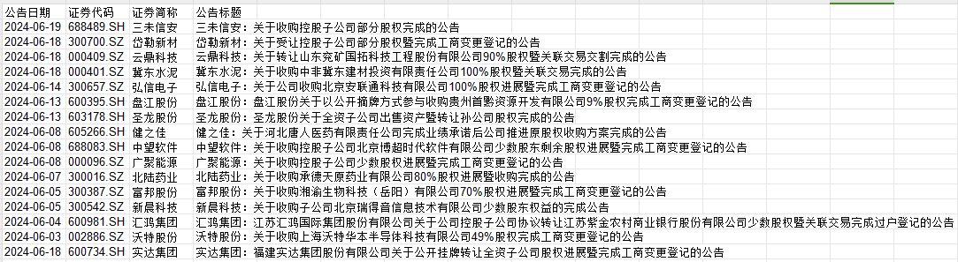 同花顺数据显示,6月以来,披露股权收购和资产重组公告的上市公司近200家。其中,有三分之一涉及交易进展公告,有16家涉及交易完成公告,有5家涉及交易终止公告,首次披露交易报告书的有12家。