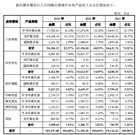 相较之下,公司光纤激光器营业收入保持更快增长,营业收入由2021年的1.89亿元增长至2023年的超7亿元,占营业收入的比例也提升至64.14%。