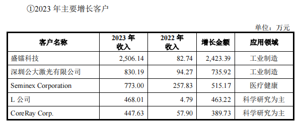 在2023年半导体激光器收入增长较快的主要客户中,盛镭科技当期向公司采购金额2,506.14万元,较上年同期增幅较大。