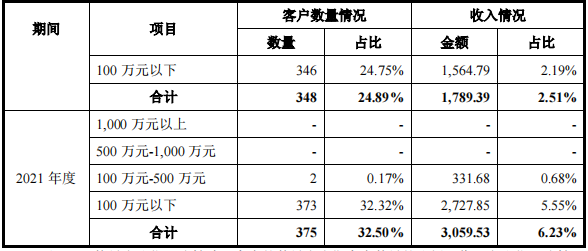 2021—2022年,公司一次性购买客户收入占比均较低,且该等客户销售金额均主要在100万元以内,表明公司主要客户黏性较强,新增主要客户在报告期内大多数均能转化为持续购买客户。2023年,公司一次性购买客户数量和金额占比显著增高。