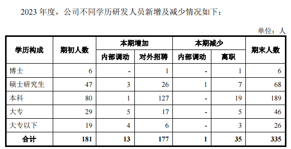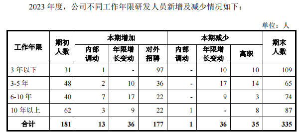 其中,研发人员较上年末增加154人。从事相关研发工作3年以下的人数较上年末增加78人。同时,大专及以下学历人员共有48人,其研发能力如何,不得而知,存在充数嫌疑。