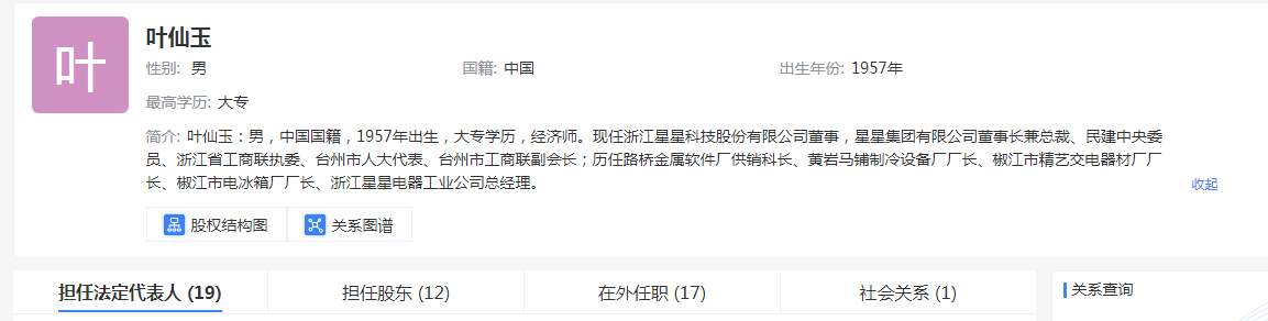 目前,叶仙玉在19家企业担任法定代表人,在12家企业担任股东,在17家企业任职。