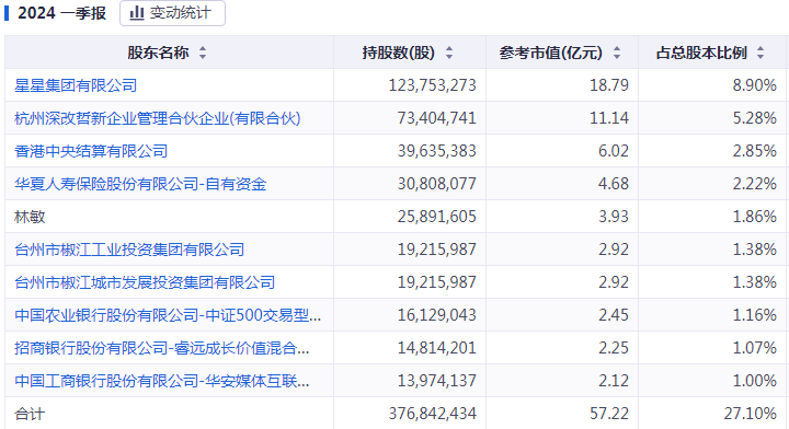 截至2024年一季度,星星集团持有水晶光电股份已将至8.90%,仍位居第一大股东。