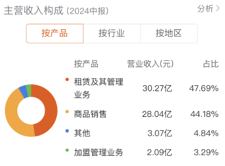 按产品分类来看,2024年上半年,居然智家的租赁及其管理业务、商品销售分别实现营收30.27亿元、28.04亿元,营收占比分别为47.69%、44.18%。显然前者的收入贡献要大于后者。