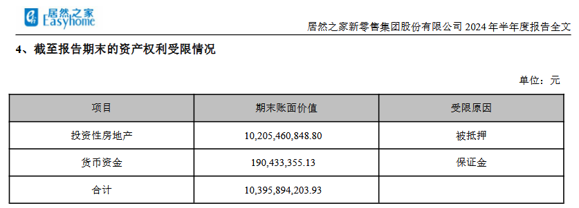 居然智家上市后的这几年,商业地产的发展遭遇一定压力。尤其是2022年,居然智家的投资性房地产亏损7000余万。截至2024年6月底,居然智家230.22亿元的投资性房地产中有102.05亿元被抵押,资产权利受限。