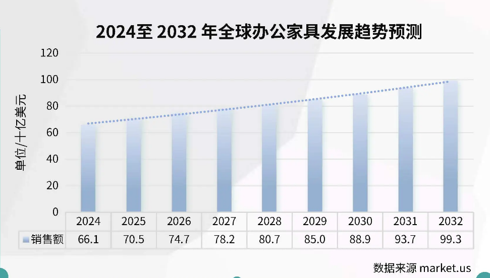 从市场前景上,Statista预测,2024年全球家用办公家具市场规模为42.50亿美元,预计到2030年将达到76.15亿美元。IMARC数据更为乐观,它预测全球办公家具市场规模将从2024年的661 亿美元增至2032年约993亿美元。但两家机构的年复合增长率预测都锁定在高于5%以上。