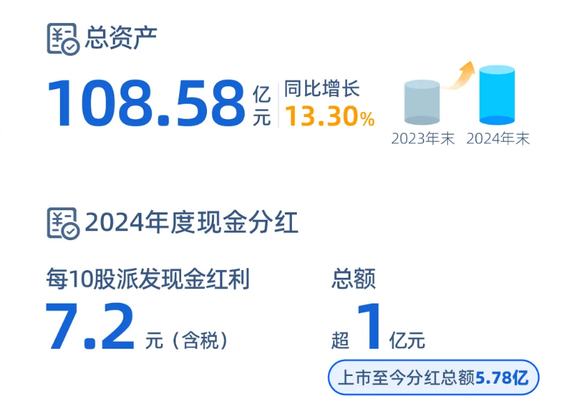 而货币资金方面,截至2024年末,余额为16.6亿元,创上市以来新高,较上一年同期增长23.88%。得益于上市以来经营业绩稳健增长,2017年至2024年公司净资产规模实现八连增,2024年末达到36.96亿元。