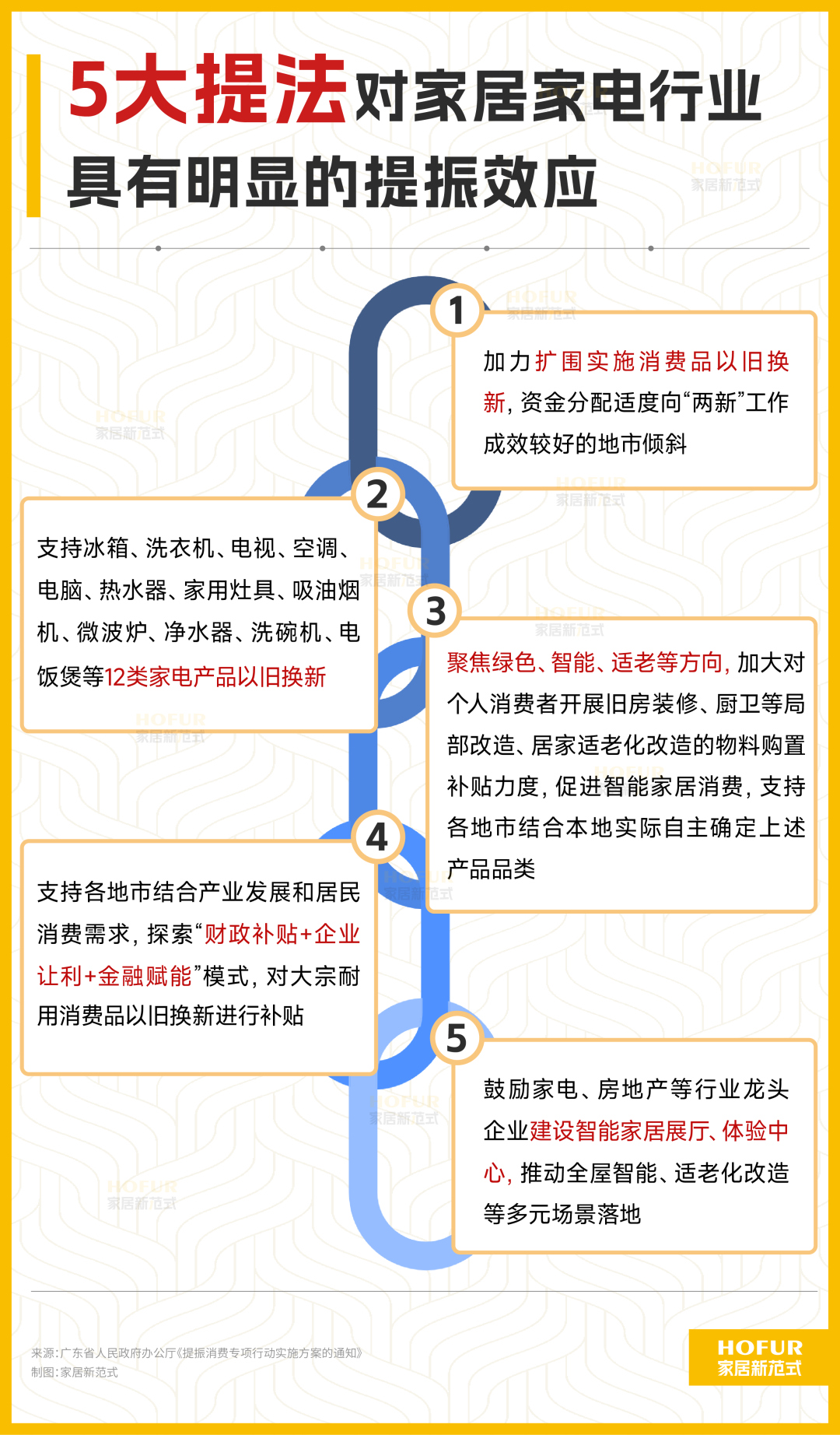 另一方面家居新范式注意到,消费大省广东也于昨日印发了《提振消费专项行动实施方案的通知》,其中提出至少有5大提法对家居家电行业具有明显的提振效应: