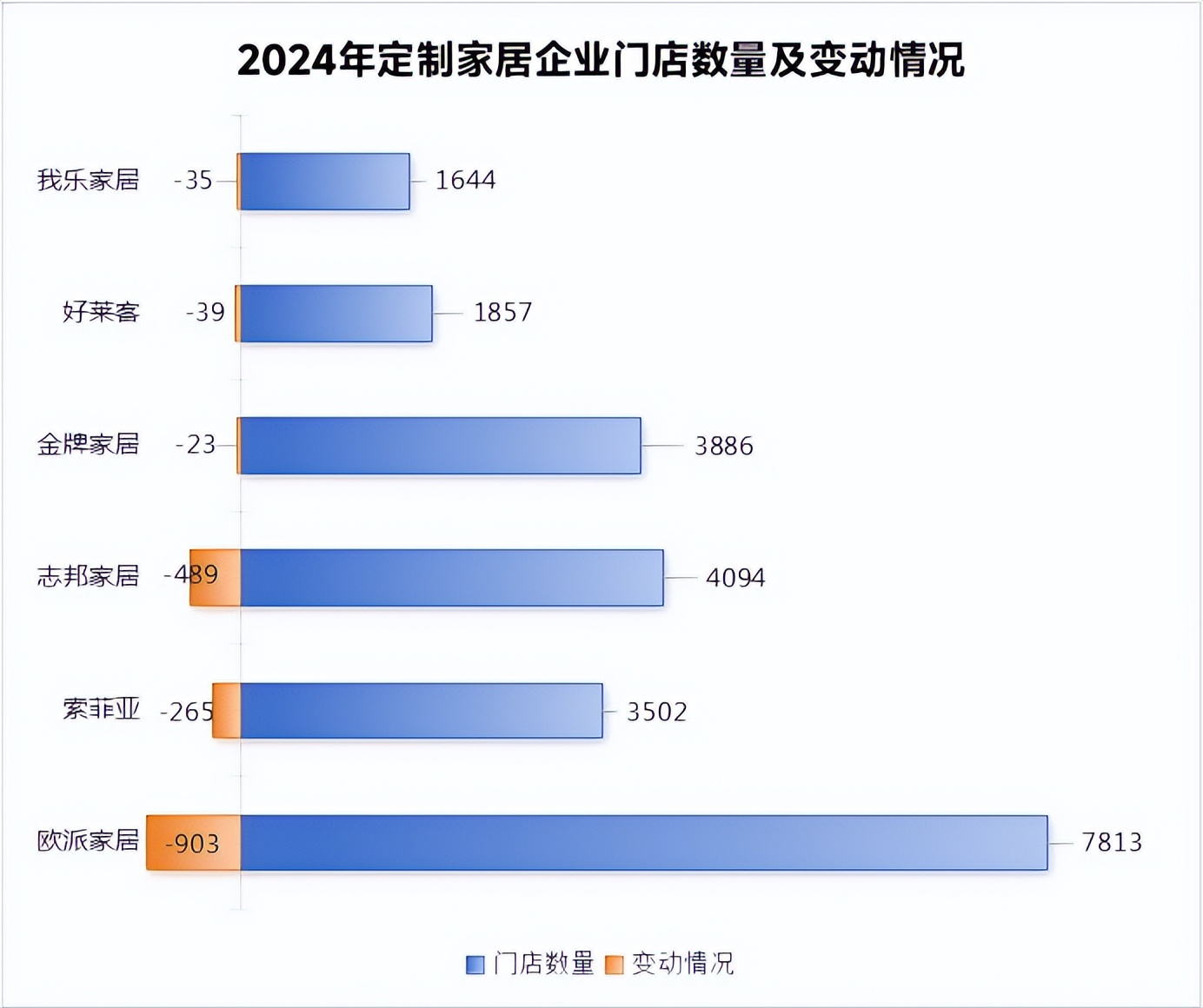 统计内的6家上市企业门店数量较上年均有所减少,其中,欧派-903家、索菲亚-265家、志邦-489家、金牌-23家、好莱客-39家、我乐-35家。