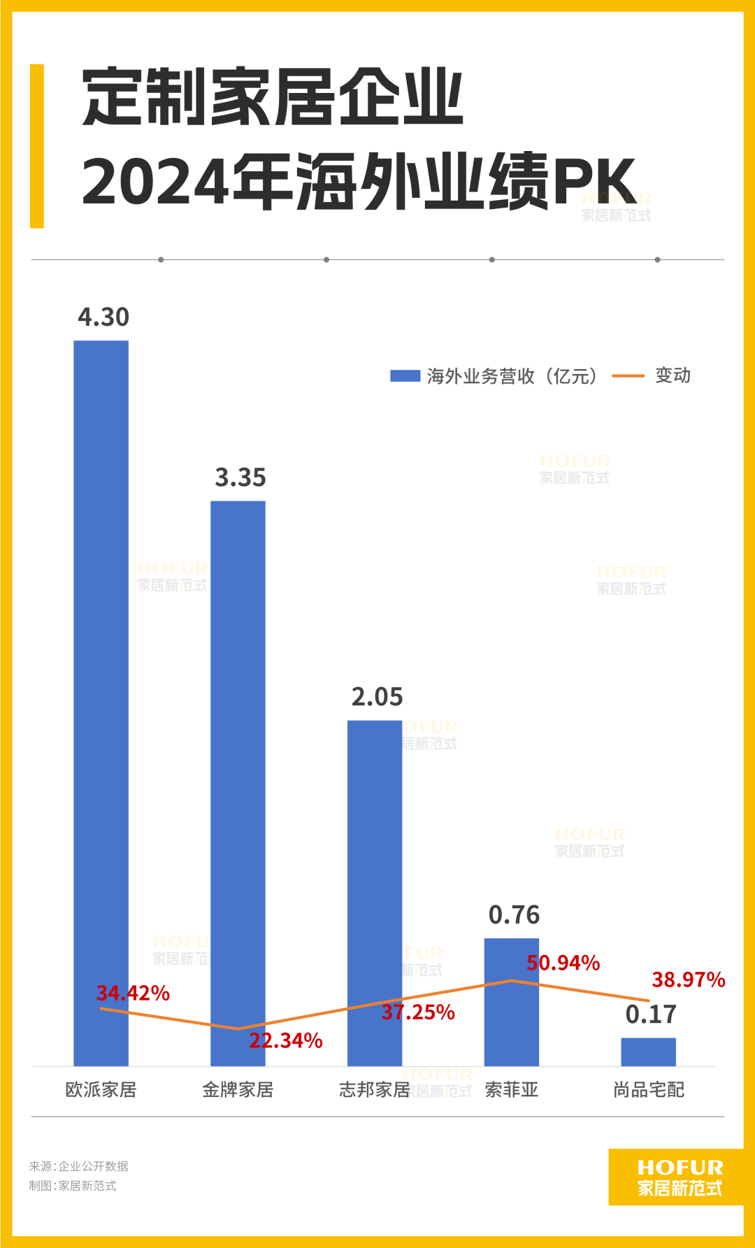 最亮眼的数据来自年内爆火的海外市场,布局海外市场的企业在海外营收上均迎来较大增幅。其中,欧派家居增长34.42%至4.3亿元,金牌家居增长22.34%至3.35亿元,志邦家居增长37.25%至2.05亿元。索菲亚、尚品宅配虽规模不足亿元,但增幅显著。