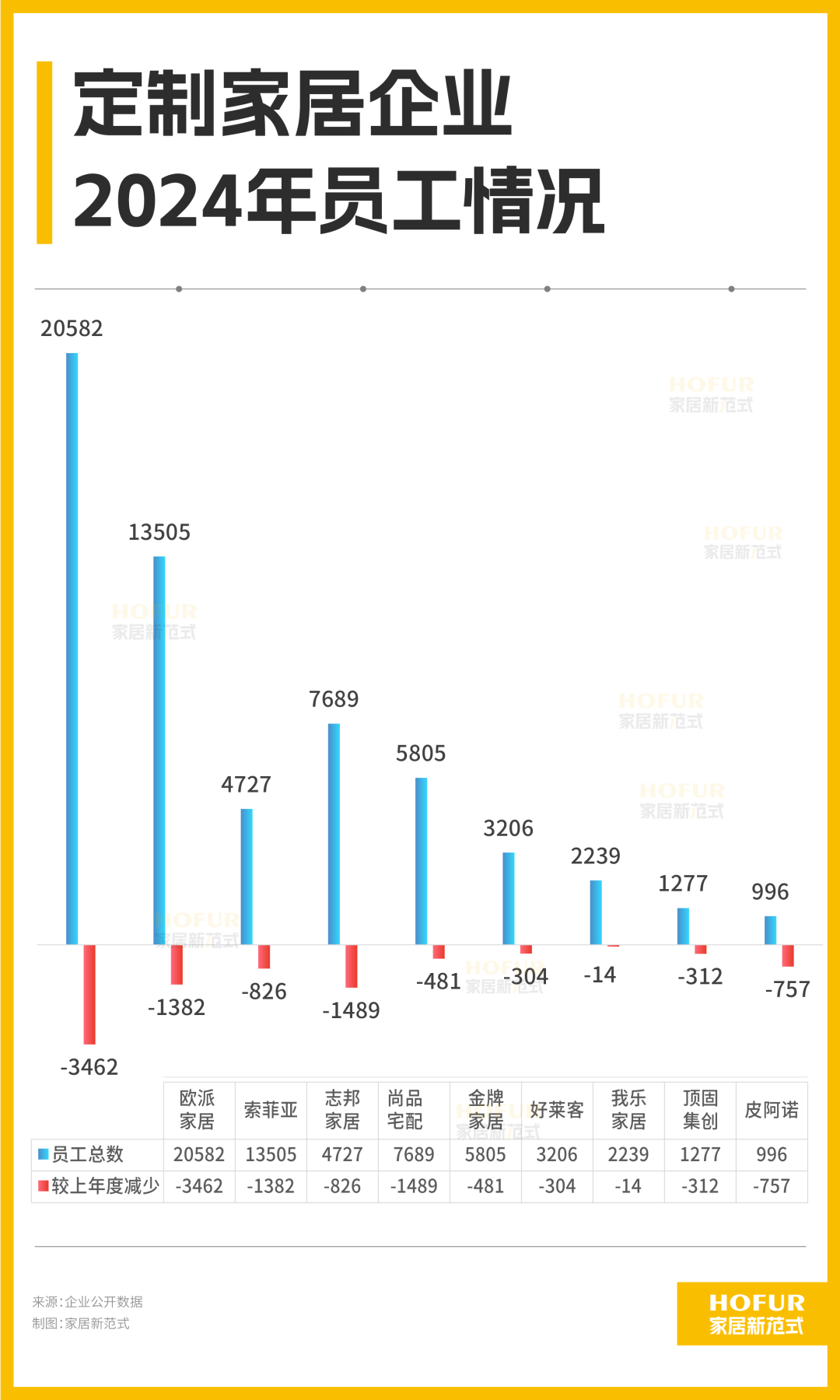从减员比例来看,以2023年底财报里9家企业员工总数69025人来计算,相当于2024年共减员13%之多。按排名列,皮阿诺、顶固、尚品宅配、志邦、欧派的减员比例分别达43.2%、19.6%、16.2%、14.9%、14.4%。