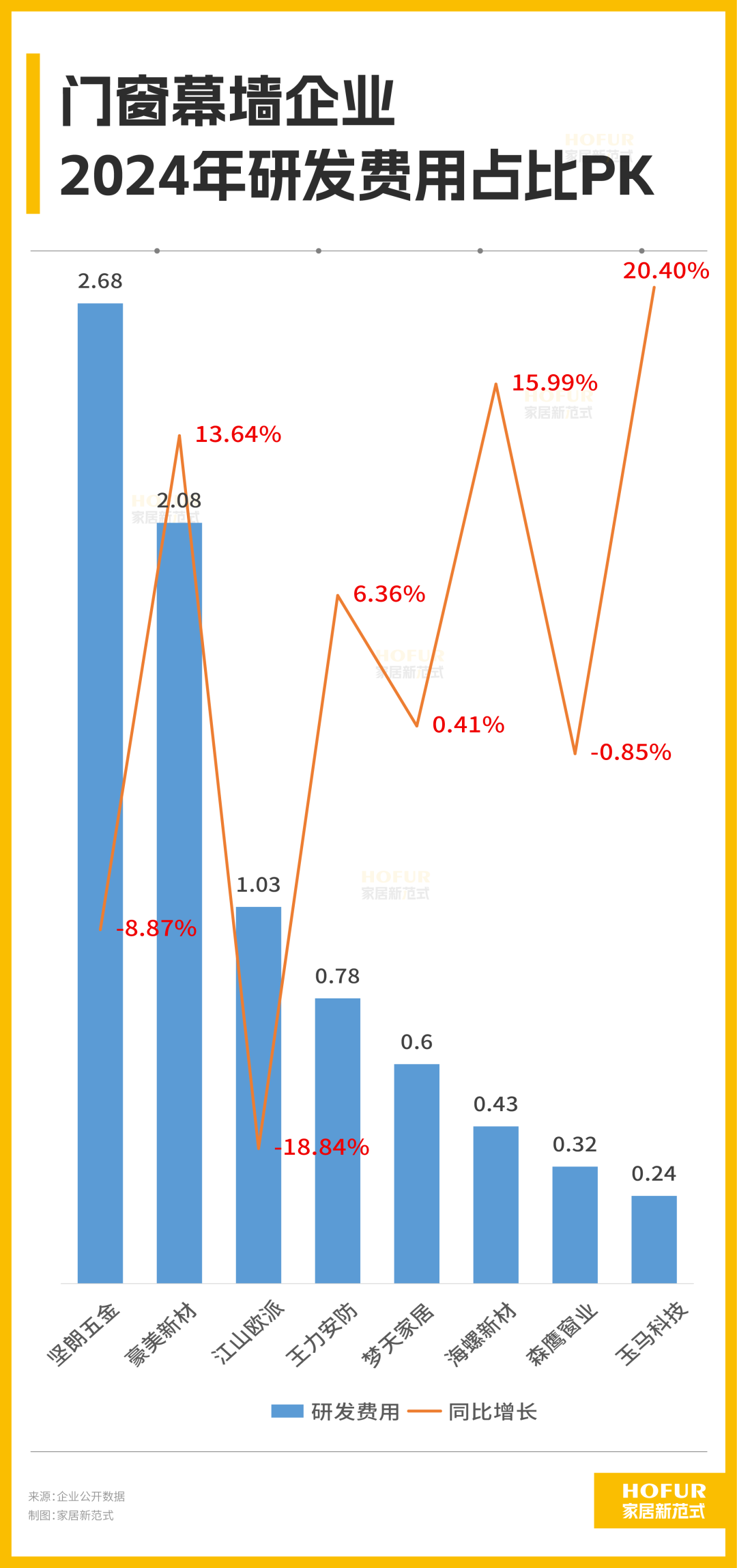 家居新范式发现,去年在研发上投入超过一个亿的门窗幕墙企业有坚朗五金、豪美新材、江山欧派三家,不过研发费用率只有森鹰窗业、梦天家居超过5%,在门窗幕墙行业属于较高水平,可见两家企业越发重视技术壁垒的构建。