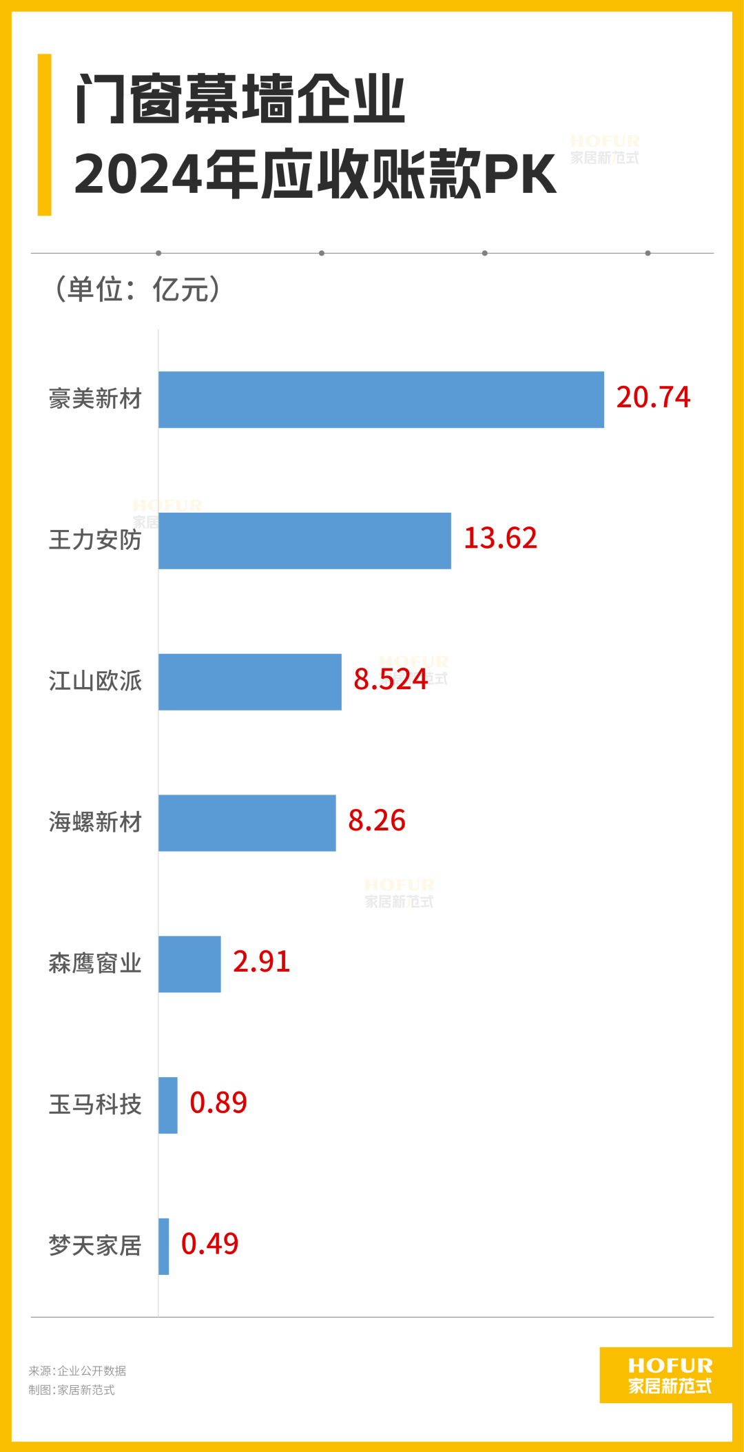 8家企业在应收账款方面,排名前五的基本是同步营收排名。不过,家居新范式注意到,江山欧派虽然营业收入只有海螺新材的六成不到,却在应收账款上领先海螺新材,可见其催收压力更大,回款速度亟待加强。