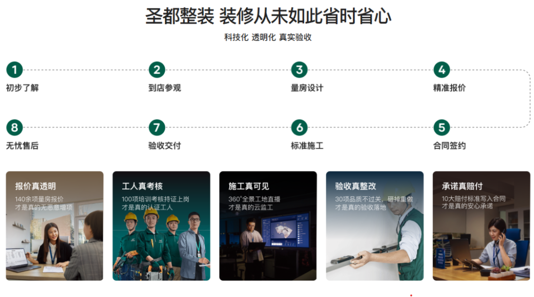 在施工的方面,贝壳旗下的被窝整装和圣都整装都探索标准化,提出工人“100项培训考核持证上岗”,施工现场“360°全景工地直播”等措施。