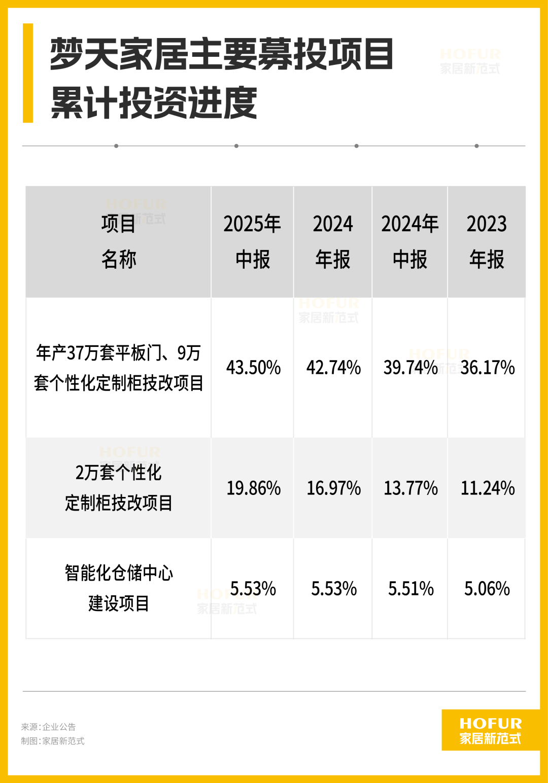 家居新范式梳理发现,这些募投项目处于“低投资”状态,甚至有的项目“按兵不动”。2024年末,上述募投项目累计投资进度分别42.74%、16.97%和5.53%;2025年6月末,相关项目累计投资进度分别为43.50%、19.86%和5.53%。