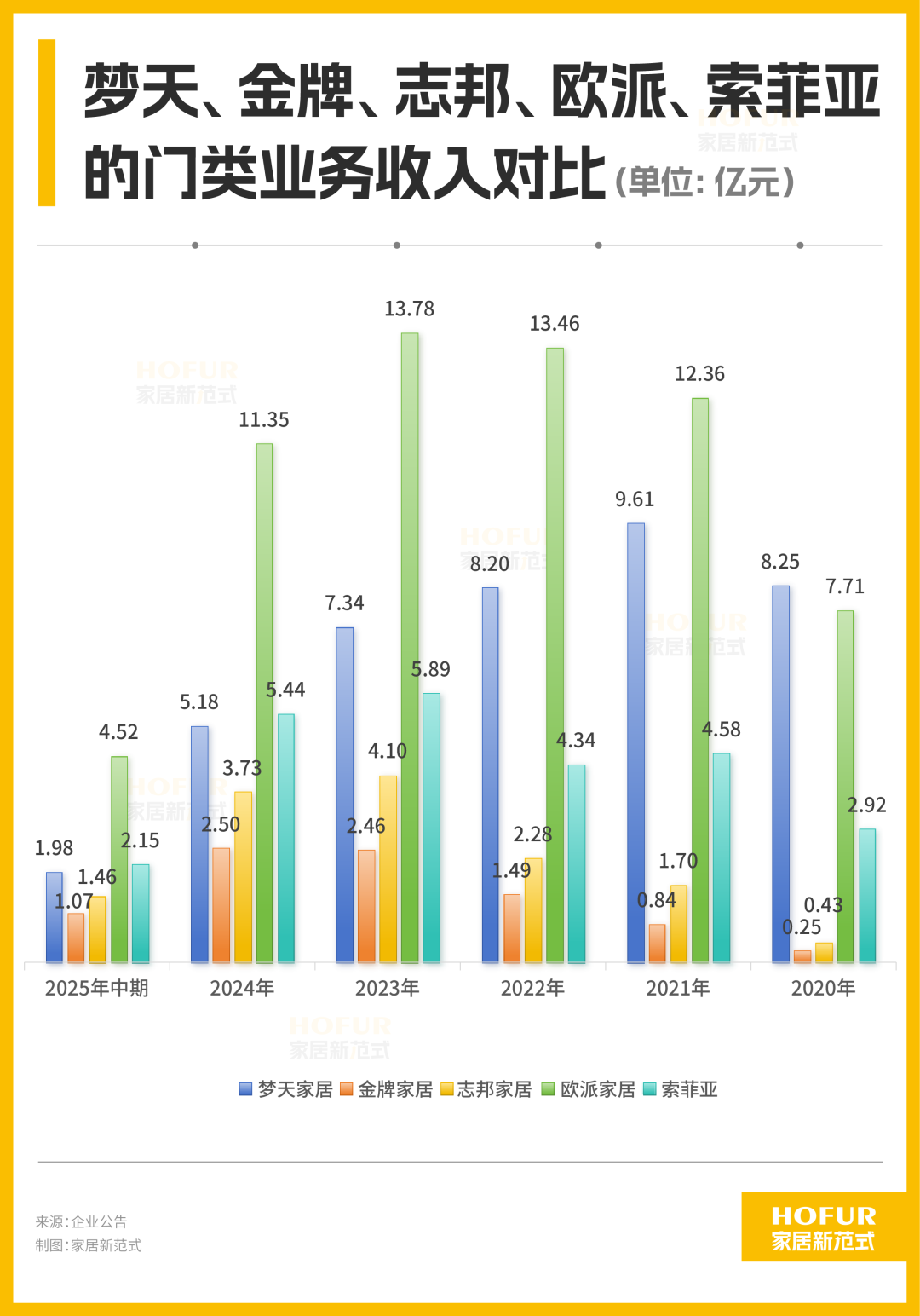 2020年,欧派家居的木门业务收入低于梦天家居,2021年就实现大幅反超,2024年木门业务收入是梦天家居的两倍;索菲亚的木门业务同样发展迅速,2024年收入正式超越梦天家居;金牌家居和志邦家居的木门业务也保持增长态势。