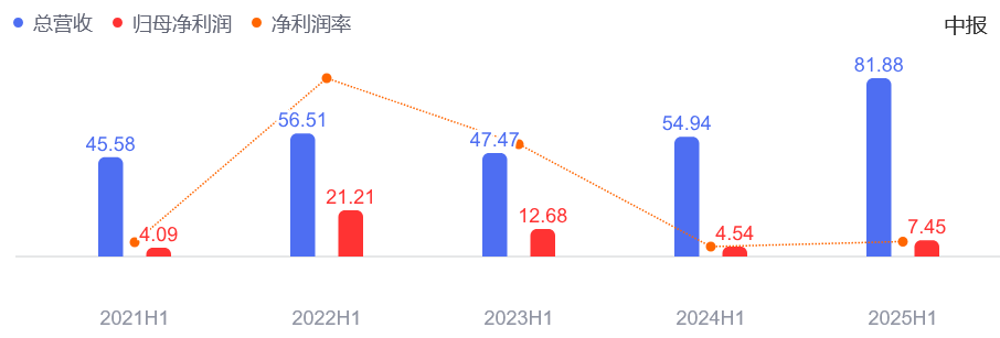 从第二次更名后的业绩看来,2020年至2022年,科达制造陶瓷机械业务和海外建筑陶瓷业务的收入快速增长,科达制造营收从72.98亿元增长至111.6亿元;净利润从2.62亿元增长至42.51亿元。2025年上半年,科达制造实现营业总收入81.88亿元,同比增长49.04%;归母净利润7.45亿元,同比增长63.95%。
