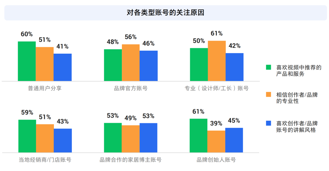 一是人设定位坚持“利他+专业”双核驱动。“利他”契合微信生态的社交分发逻辑,只有真正为用户提供价值的内容,才可能被转发、扩散,从而获取初始流量并实现破圈;而“专业”则呼应理性高质的用户需求,他们更青睐能解决实际问题的深度内容。从视频号用户的家居内容偏好来看,装修改造技巧、产品评测推荐、装修知识科普等内容稳居前三。