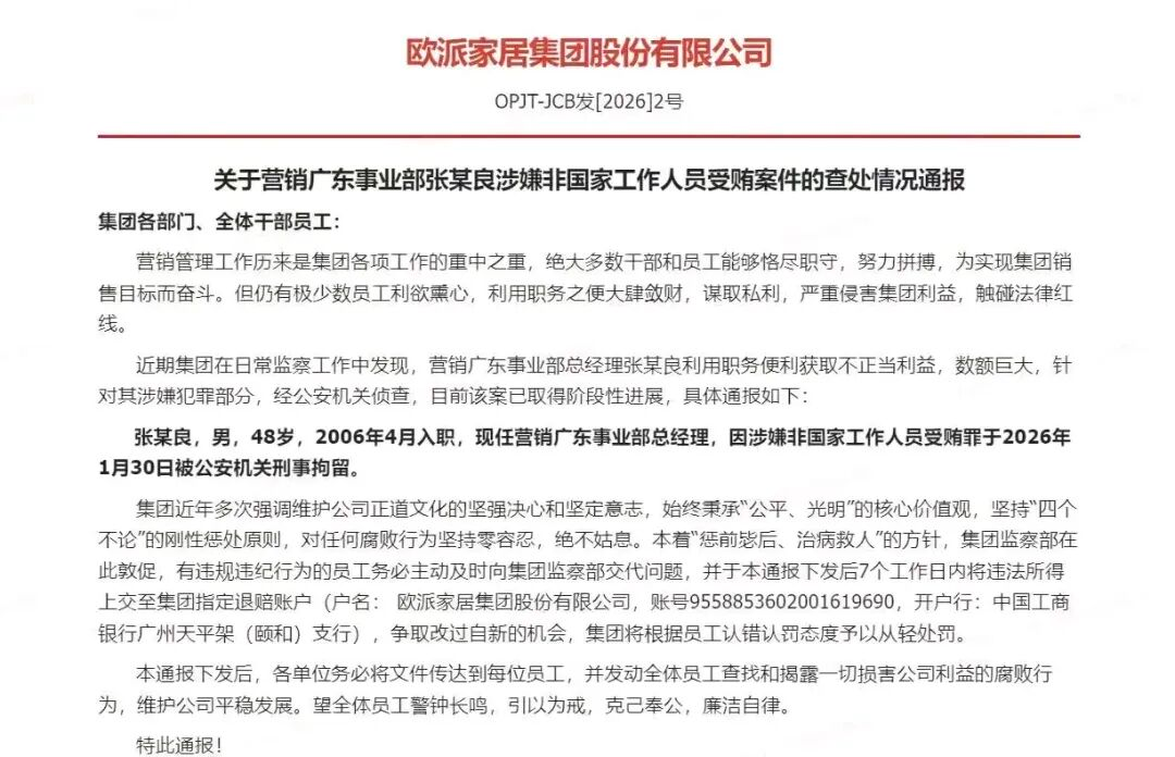 欧派家居近日发布通报,其营销广东事业部总经理张某良因涉嫌非国家工作人员受贿罪被依法刑拘,且涉案数额标注为“巨大”,目前该案已取得阶段性进展,公安机关于2026年1月26日依法对张某良刑事拘留。