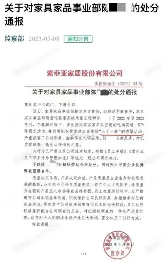 索菲亚2023年曾发布内部通报,其家具家品事业部质量巡检室高级质量工程师陈某某,因多次接受供应商宴请及娱乐活动安排,被即时解除劳动合同,并将其列入中国企业反舞弊联盟黑名单。