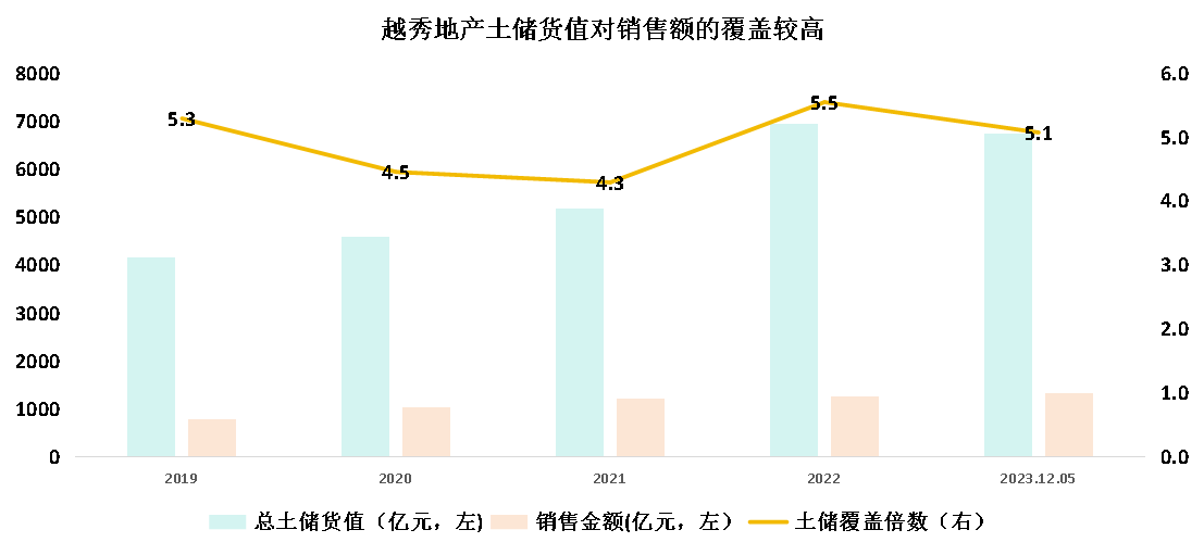 在2022年越秀地产一口气拿下37个项目后,这也使得今年初时的土储达到2845万方,土储货值也上升至6929.1亿元,对 2022 年销售金额(1250.3亿元)的覆盖倍数达 5.5 倍。